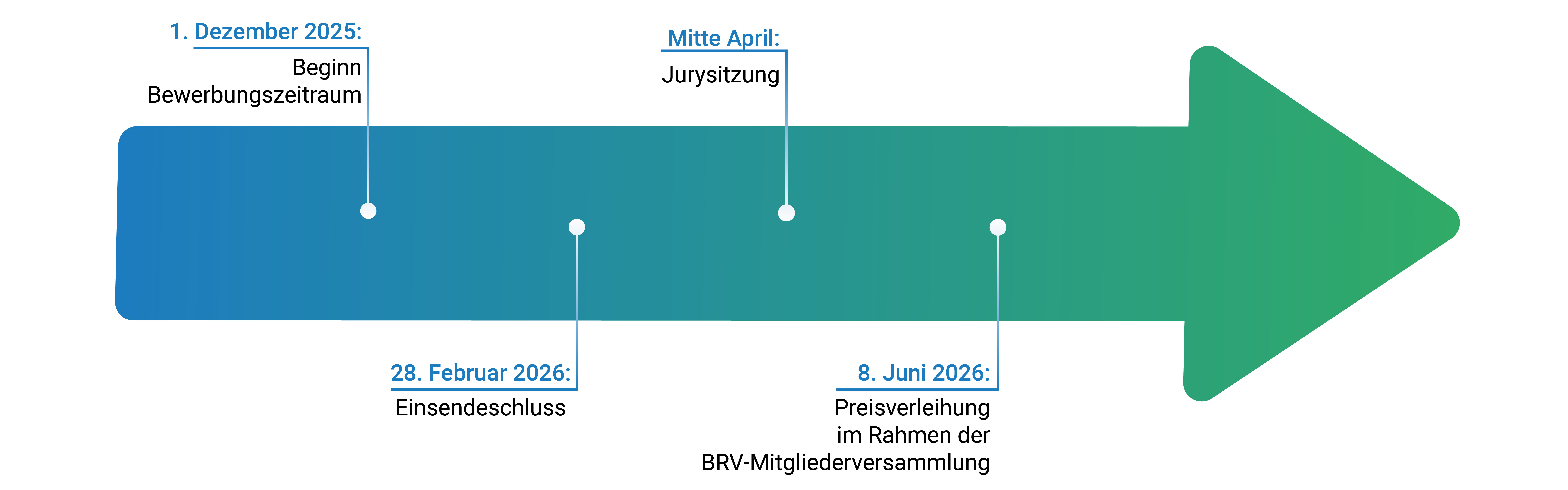 Vom 01.12.2025 bis zum 28.02.2026 können sich alle bewerben, die im Jahr 2025 die Ausbildung in einem technischen oder kaufmännischen Ausbildungsberuf bei einem BRV-Mitgliedsunternehmen erfolgreich abgeschlossen haben. Dabei sein können auch Azubis, die im Frühjahr 2026 ihre Ausbildung beenden. Wichtig: Bewerbung rechtzeitig absenden und Abschlusszeugnis bis spätestens zur Jurysitzung im April 2026 vorlegen.